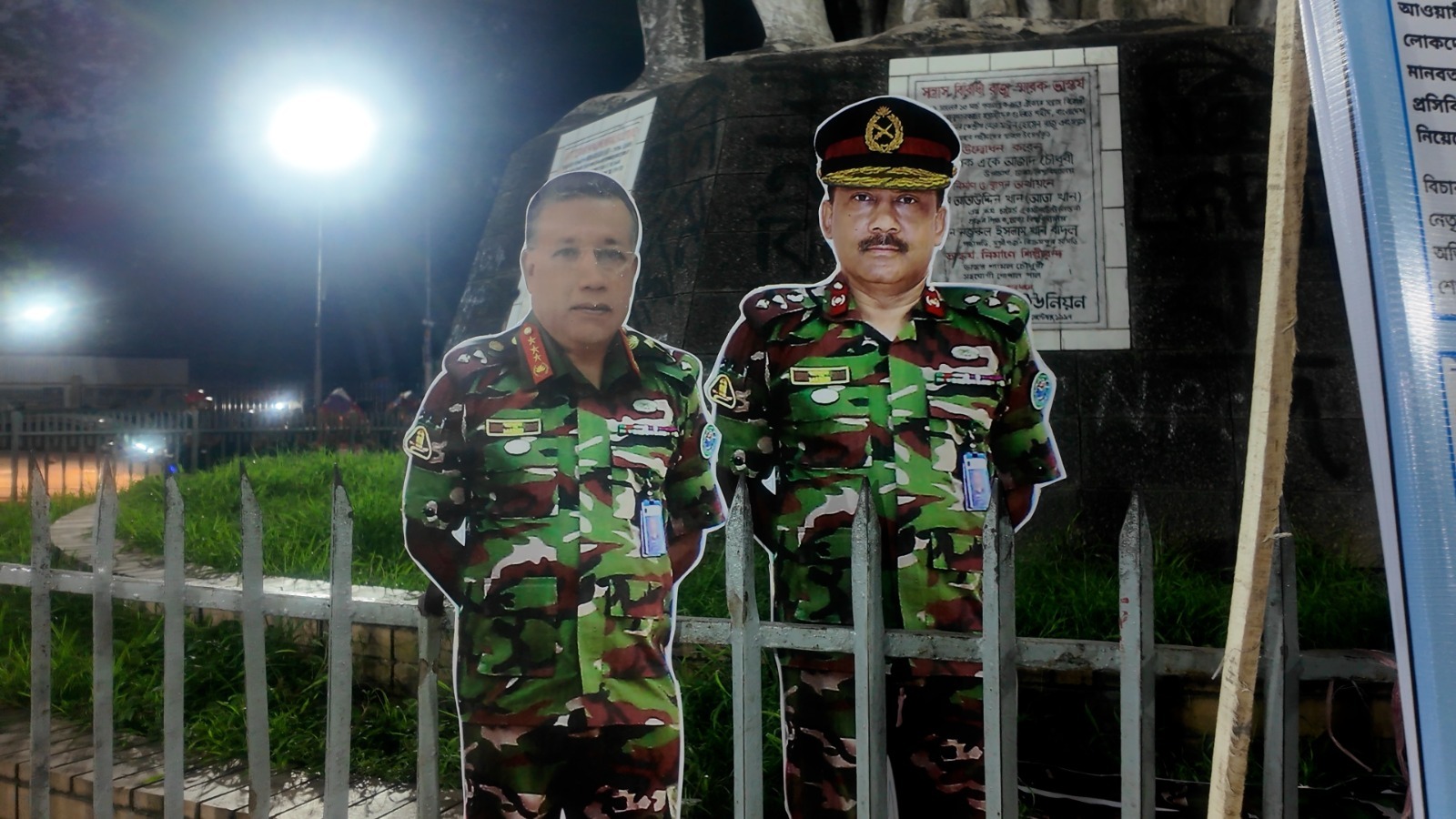 ঢাকার শাহবাগে রাজু ভাস্কর্যের পাশে ঝুলিয়ে দেওয়া হয়েছে গুম সংক্রান্ত মামলার ওয়ারেন্টভুক্ত সেনা কর্মকর্তাদের ছবি। মানবাধিকার সংগঠনগুলোর দাবি, এ ঘটনার